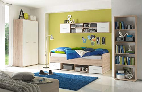 NANU Jugendzimmer Komplett-Set in Eiche San Remo Optik, Weiß – Kinderzimmer Möbel-Set 4-teilig bestehend aus Kleiderschrank, Bett, Standregal & Wandboard
