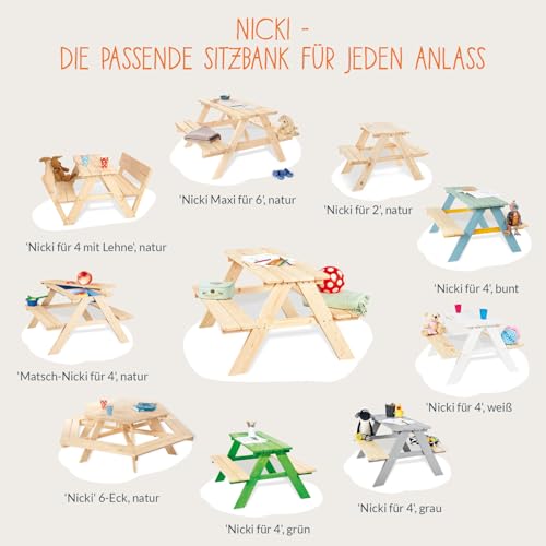 - Die ‚Matsch-Nicki‘ darf bei Outdoorfans auf keinen Fall fehlen. Kleine Sterneköche können hier ihre Kreativität frei ausleben und Sandtorten, Grasaufläufe oder Kieseleintöpfe zubereiten. Empfohlen ist unsere Kindersitzgruppe für Kinder von 2 bis 7 Jahren