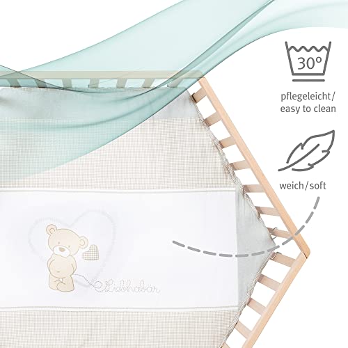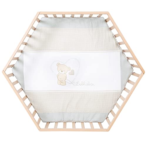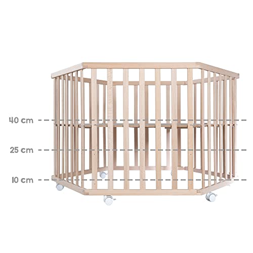 - Das 6-eckige Holz-Laufgitter ist mit kuscheliger Textileinlage und mit Flachstäben ausgestattet.
