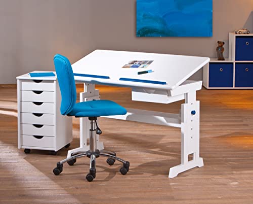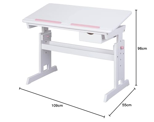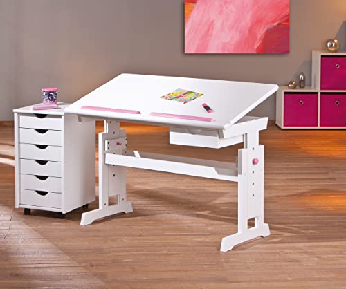 Schreibtisch aus massiver Kiefer, weiß-rosa Ausführung, neigbare Platte und höhenverstellbare Struktur