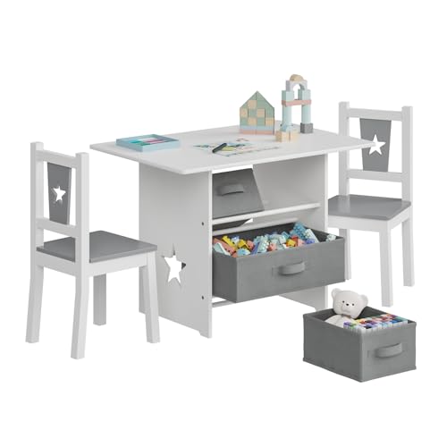 - Dreiteilige Kindersitzgruppe mit Sternenmustern: Diese Sitzgruppe besteht aus einem Tisch und zwei Stühlen. Die Stuhllehnen sind mit einem kindergerechten und niedlichen Sternmotiv Ausschnitt versehen, das den ästhetischen Vorstellungen der Kinder entspricht. Dank der kindergerechten Maße bietet die Kindersitzgruppe den Kindern den Platz, um selbstständig zu essen, zu spielen, zu malen und ihren eigenen Interessen nachzugehen. Zudem ermöglichen die zwei Stühle, den Spaß mit Freunden zu teilen
